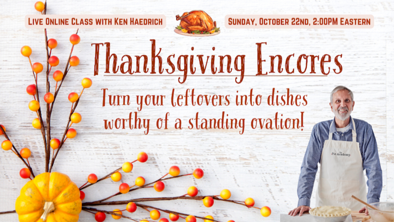 The best part about Thanksgiving dinner? The leftovers! So says Ken Haedrich, dean of The Pie Academy. In this first of its kind class, Ken will show you that your Thanksgiving leftovers don't have to be dry, dowdy, or yawn-inducing. Indeed, they can steal the show and have you counting the hours until your hunger returns. We're talking irresistible dishes like Turkey Pot Pie...Turkey, Brie & Spinach Panini...and Loaded Blue Cheese & Bacon Potato Patties. And for that spare can of pumpkin puree you didn't use, he's got something extra special planned - Pumpkin Pie Icebox Cake. It all adds up to an afternoon of fabulous, pre-Thanksgiving cooking, and we're delighted that you'll be joining us.